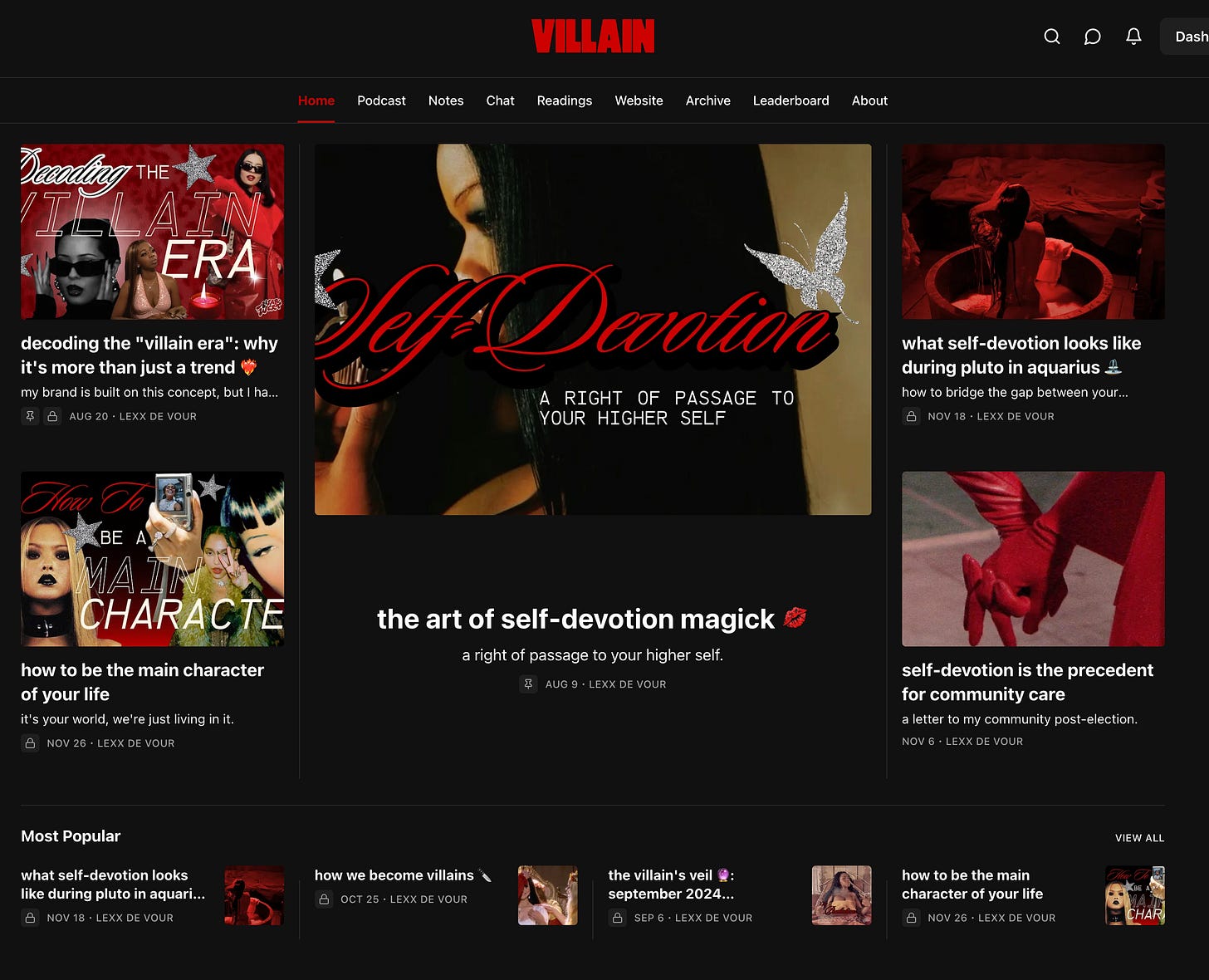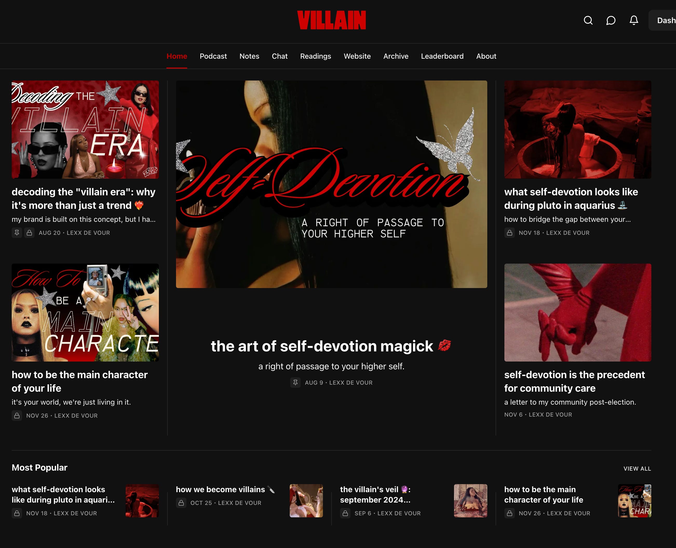 Hearing about the experiences that led to Lexx’s success almost freaked me out with some of the similarities - I have also just returned from a social media hiatus after starting to gain a reputation that I didn’t ask for, or particularly want. The fact is that stepping into online spaces as a magnetic individual puts a spotlight onto you, and if you aren’t ready to shout with your chest exactly who you are, your audience will decide it for you. I used to be terrified of what peoples’ reactions might be if they discovered the real complexity of who I am, so would show up online carefully curated and user friendly, and as such - I would be misunderstood. This is exactly why Lexx’s VILLAIN publication spoke to me, because they spoke about embracing the parts of you that you’ve feared others may reject, and being proud of the taste you leave in people’s mouths, even if it’s sometimes bitter. Nurturing my own villain side may have made me less appealing to some, but it brought me back to what I love in life, and it really showed me that the right people will be drawn in.